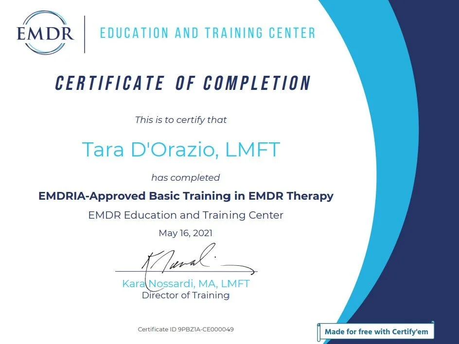 May 16, 2021 - I have completed the EMDR Basic Training through the EMDR Education and Training Center and begun consultation hours towards certification.